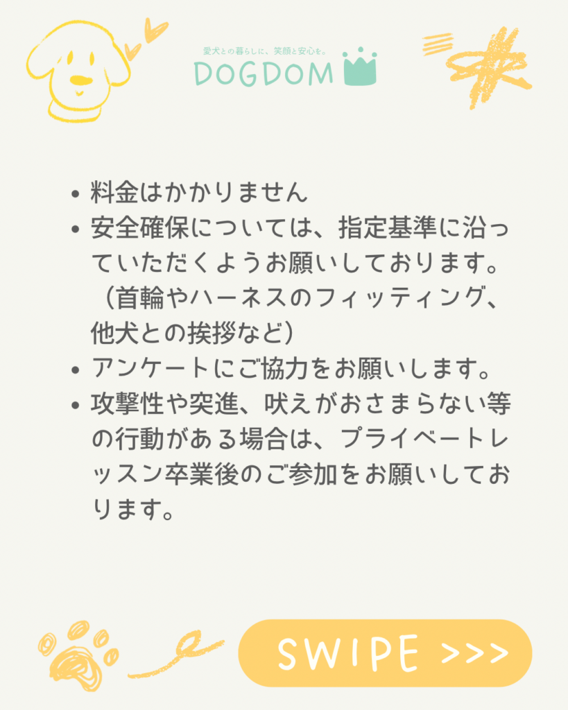• 攻撃性や突進、吠えがおさまらない等の行動がある場合は、プライベートレッスン卒業後のご参加をお願いしております。