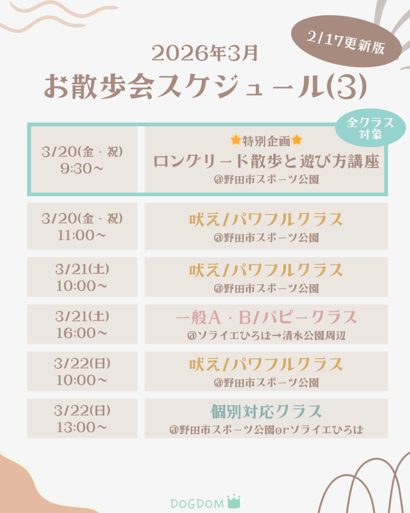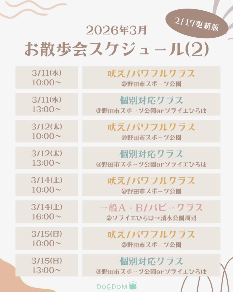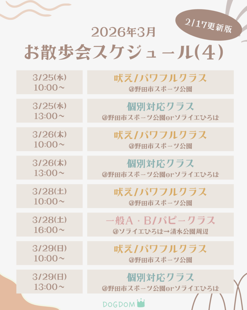 クラス分けは、お申し込み後、LINEにて簡単な質問にご回答いただき、お客様のご希望もお伺いしたうえで、DOGDOMのスタッフが決めさせていただきます。
